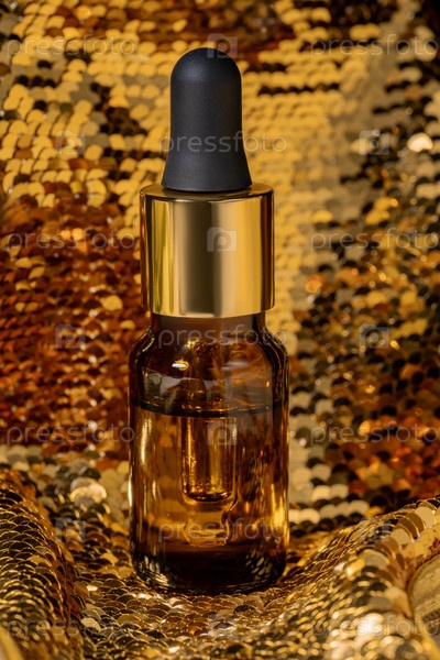 Макет янтарного стеклянного флакона с золотой крышкой-капельницей на фоне из золотистых блесток. Сыворотка для лица, эфирное масло для ухода за женской кожей, косметика класса люкс, макет
