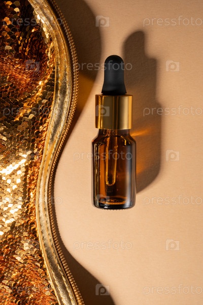 Масло для лица в бутылке из янтарного стекла с золотой крышкой и капельницей рядом с золотым фоном из блесток. Вид сверху. Уход за собой и красота для рождественских новогодних праздников