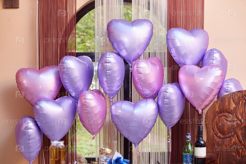 Воздушные фольгированные шары в форме сердца. Интерьер комнаты украшен ко Дню святого Валентина, свиданию, дню рождения