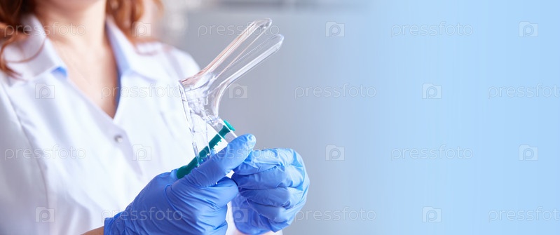 Гинекологический инструмент в руках врача. Расширительное зеркало для гинекологических процедур. Пустое место для текста или продукта