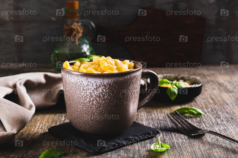 Паста с тертым сыром, запеченная в кружке, и листья базилика на столе