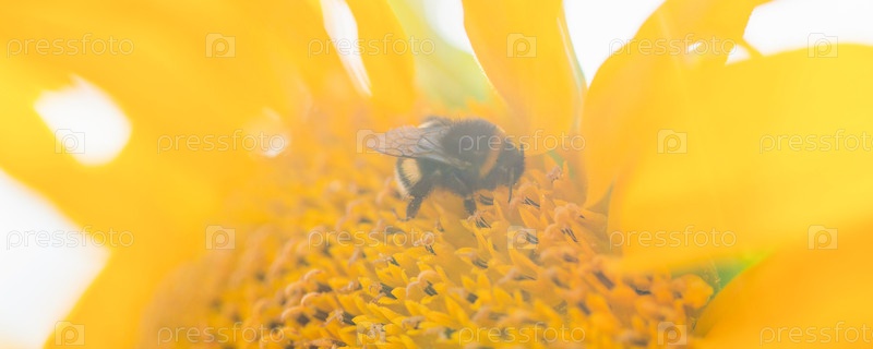 Милый мохнатый шмель сидит на подсолнухе в ясный солнечный день, позитивное изображение