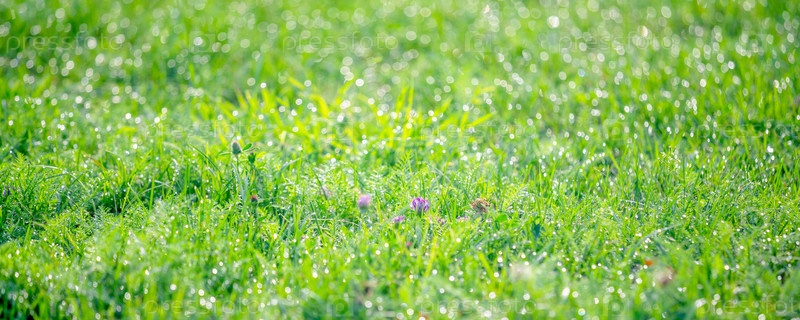 Зеленая трава с каплями росы под утренним солнцем, крупный план, размытый фон