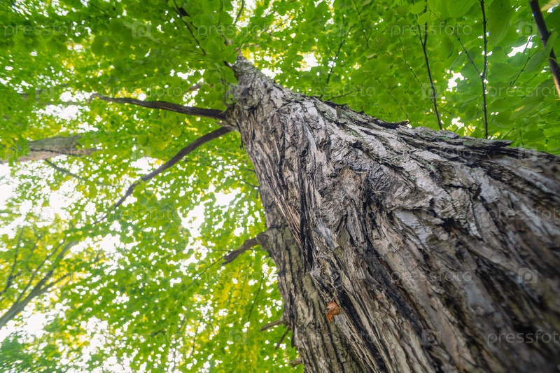 Большие деревья в лесу с пышной зеленой листвой, вид снизу