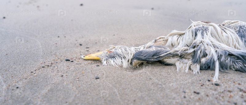 Мертвая чайка на берегу моря, крупный план, размытый фон