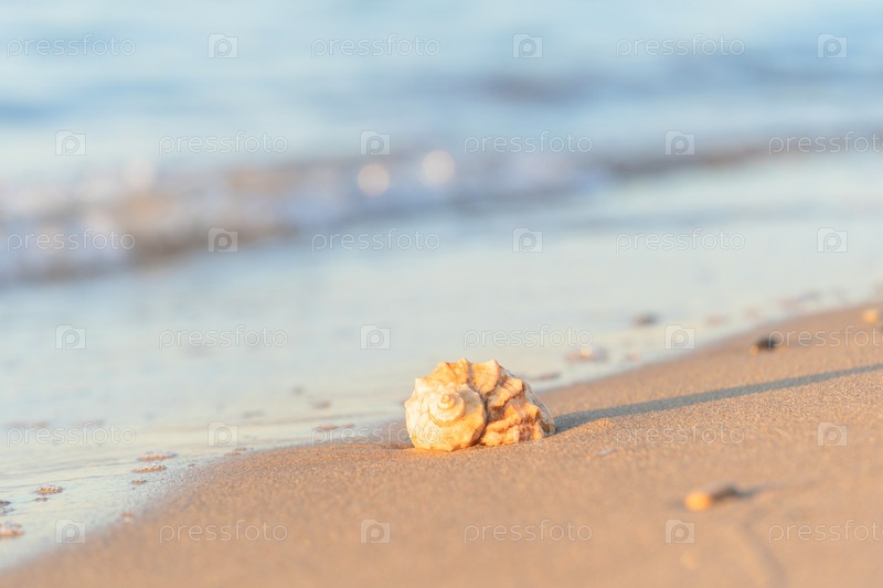 Красивая ракушка лежит на пляже, рядом с лазурной водой моря
