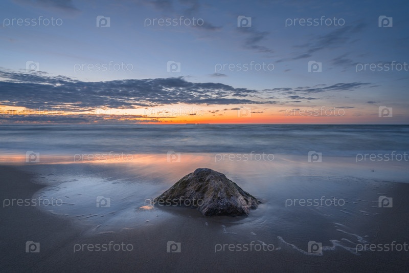Камень в волнах моря после захода солнца, длительная выдержка