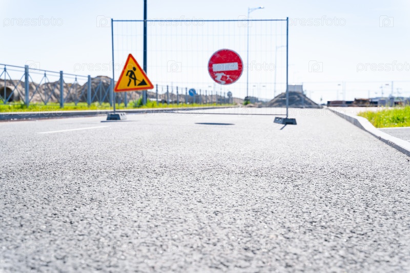 Строительный забор на городской улице, знак «дорога закрыта», фокус на переднем плане, размытый фон