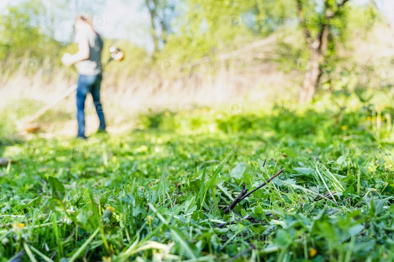 Мужчина косит траву триммером, фокус на переднем плане, размытый фон