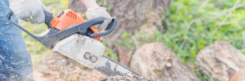 Фермер пилит дерево бензопилой, выборочный фокус, фокус на переднем плане, размытый фон