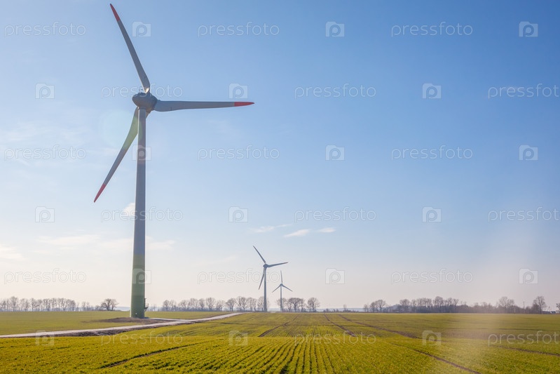 Ветряная турбина на зеленом поле с солнечными бликами на фоне голубого неба