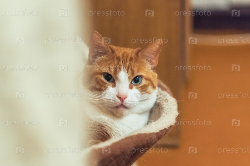 Ленивый рыжий кот лежит в кошачьем домике