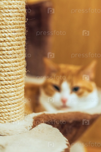 Кошачья когтеточка в кошачьем доме, рыжий кот на заднем плане