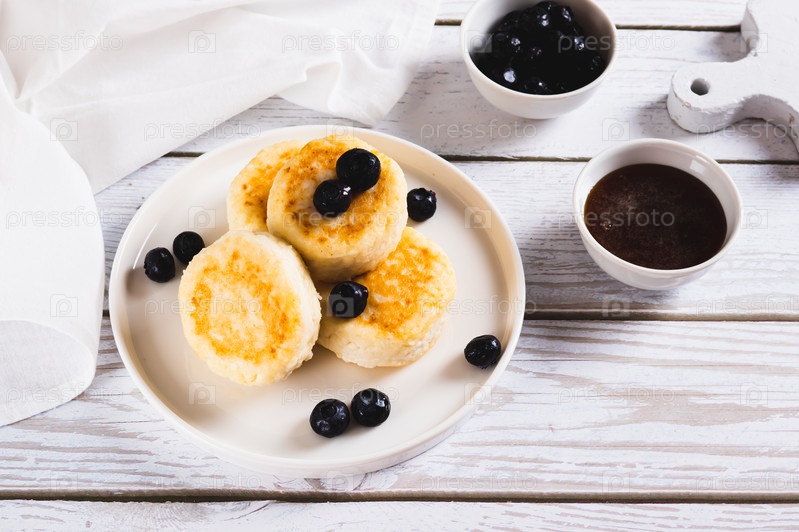 Домашние сырники и черника на тарелке на столе