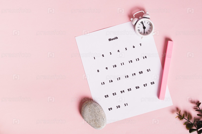 Календарь, будильник и маркер на розовом фоне вид сверху веб-баннер