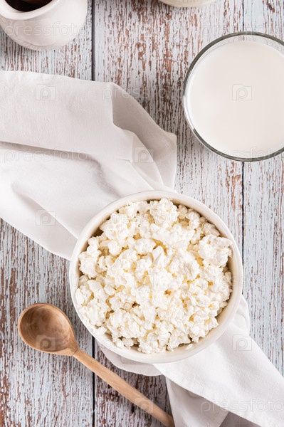 Домашний фермерский творог в миске на столешнице и вертикальный вид