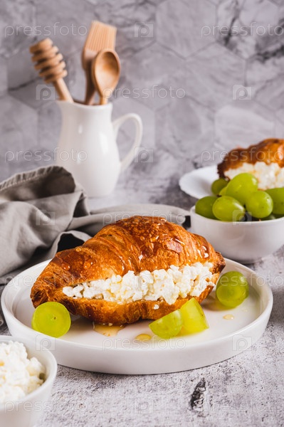 Вкусный круассан с творогом и виноградом на тарелке на столе вертикальный вид