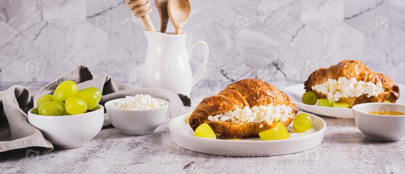 Вкусный круассан с творогом и виноградом на тарелке на столе веб-баннер