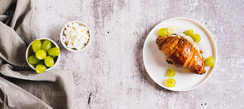 Круассан с рикоттой, виноградом и медом на тарелке на столешнице веб-баннер