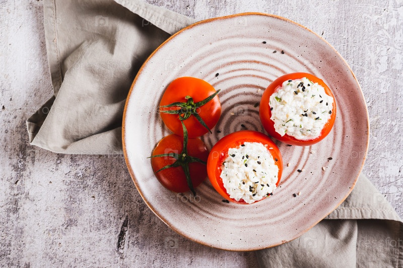 Крупный план свежих помидоров, фаршированных творогом и зеленью на тарелке на столешнице