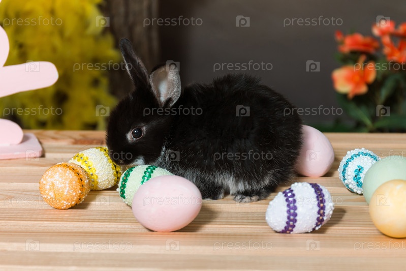Забавный маленький черный кролик сидит среди пасхальных яиц