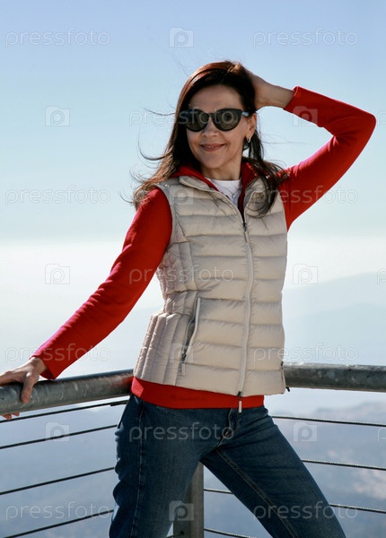 Довольная женщина 51 год в спортивном луке и солнцезащитных очках позирует на фоне гор и голубого неба Анталья Кемер