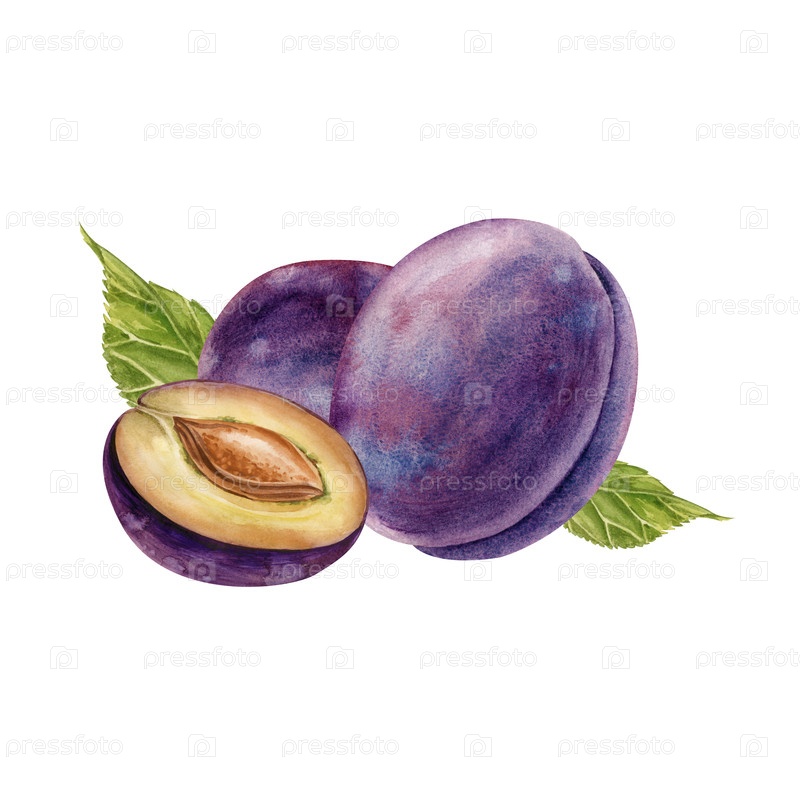 Акварельная композиция со сливами и зелеными листьями. Рисованная ботаническая иллюстрация на белом фоне. Для оформления открыток, приглашений, баннеров