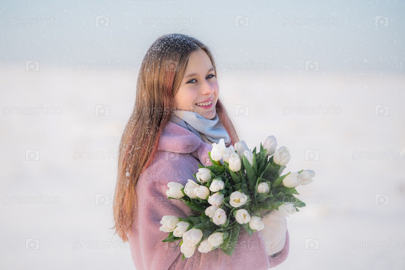 Улыбающаяся молодая девушка в зимней одежде держит букет белых тюльпанов на фоне снежного пейзажа
