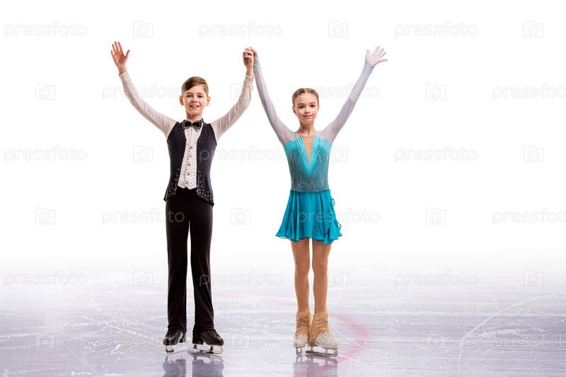 Юные фигуристы в элегантных танцах на льду - спортивные пары на соревнованиях, изолированные на белом фоне