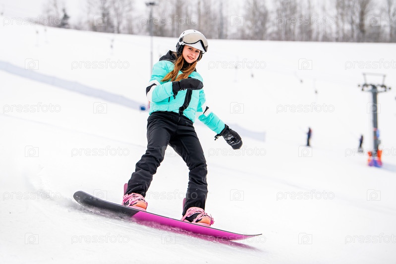 Молодая сноубордистка скользит по снежному склону, одетая в стильную зимнюю одежду. Захватывающие зимние виды спорта и приключения на свежем воздухе