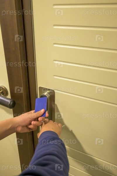 Рука держит синюю карточку-ключ возле замка двери отеля в длинном коридоре, электронный замок, номер в отеле, отдых на Майорке, Испания,