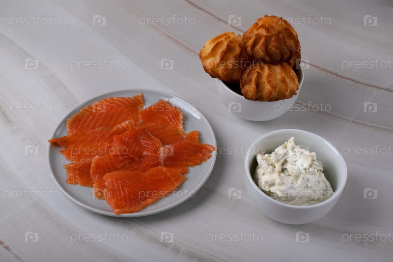 Кусочки соленой форели, сливочный сыр с укропом и профитроли. Ингредиенты для приготовления закуски