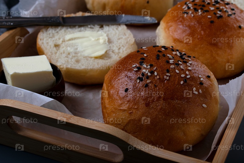 Дрожжевые булочки с кунжутом на деревянном подносе, подаются со сливочным маслом