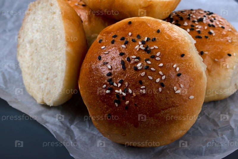 Дрожжевые булочки с кунжутом на сером фоне. Домашнее хлебобулочное изделие. Крупный план