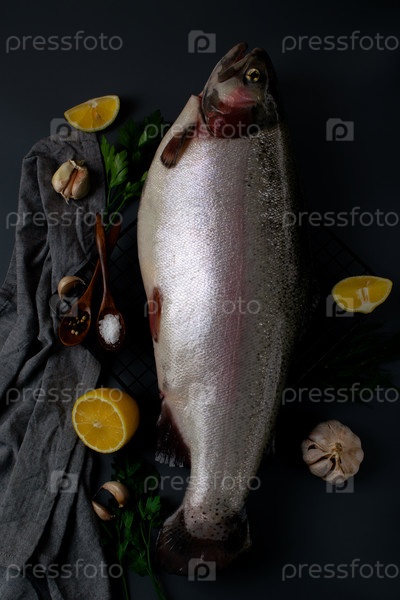 Свежая целая радужная форель, лимоны, чеснок, травы и специи на решетке для готовки. Вид сверху