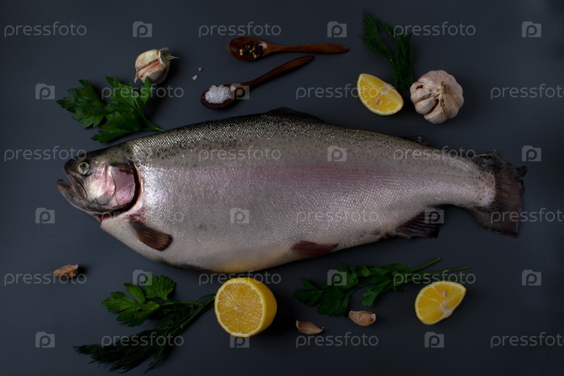 Свежая целая радужная форель, лимоны, чеснок, травы и специи на сером столе. Вид сверху