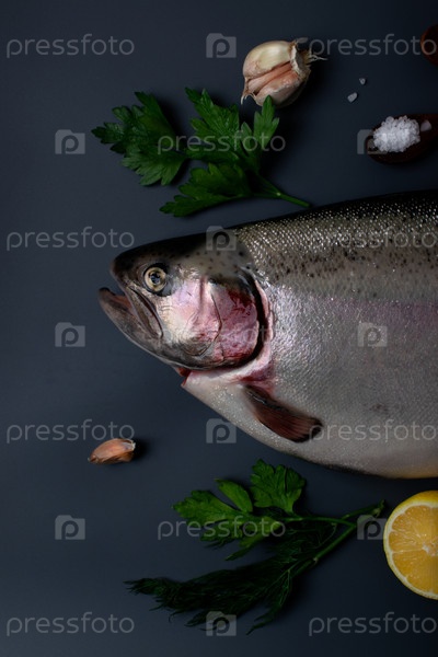 Свежая радужная форель, лимон, чеснок, зелень и соль на сером столе. Вид сверху