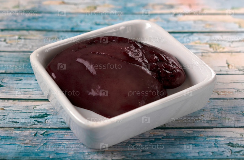 Сырая печень форели в керамической миске. Рыбные потроха