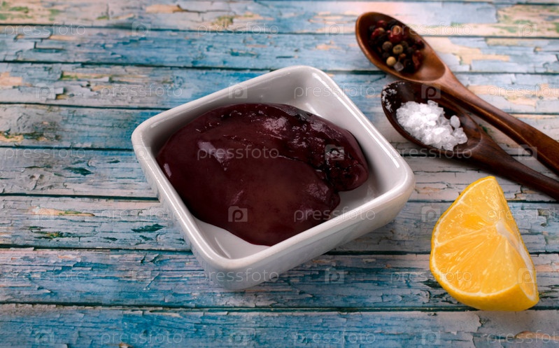 Сырая печень форели в керамической миске, лимон, соль и перец в деревянных ложках. Рыбные субпродукты. Никаких отходов