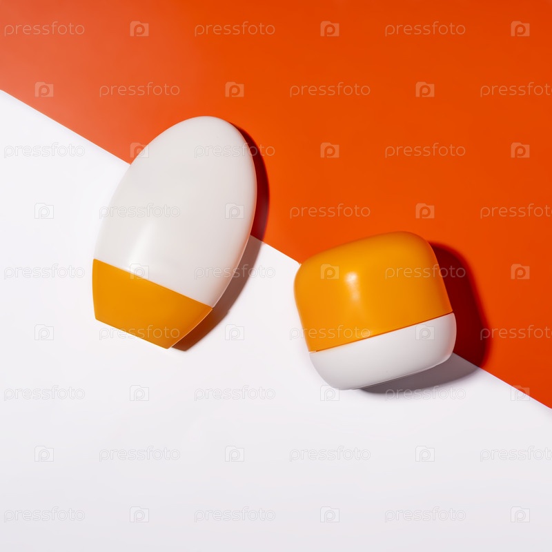 Две пластиковые бутылки без ярлыков на двойном белом и оранжевом фоне.Презентация косметики по уходу за кожей с солнцезащитным кремом SPF