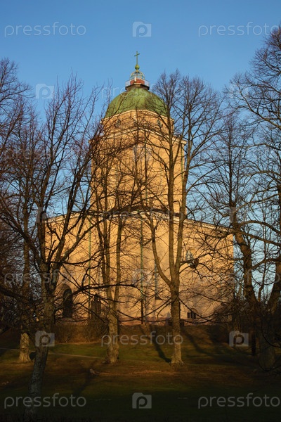 Суоменлинна, Хельсинки, Финляндия - 01.2020: Церковь Суоменлинна под заходящим солнцем за голыми деревьями. Вид сбоку