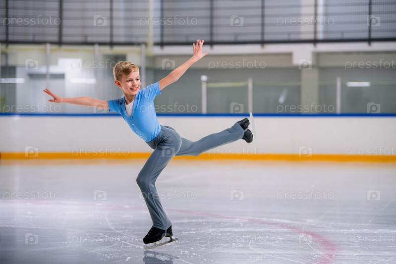 Мальчик катается на коньках по льду, раскинув руки. Он одет в черный костюм и выполняет трюк