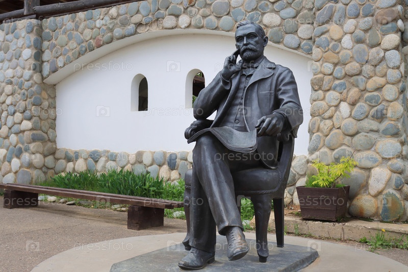 Деревня Петрово, Калужская область — апрель 2024 г.: Бронзовая скульптура Альфреда Нобеля в туристическом комплексе «Этномир», горизонтальное изображение
