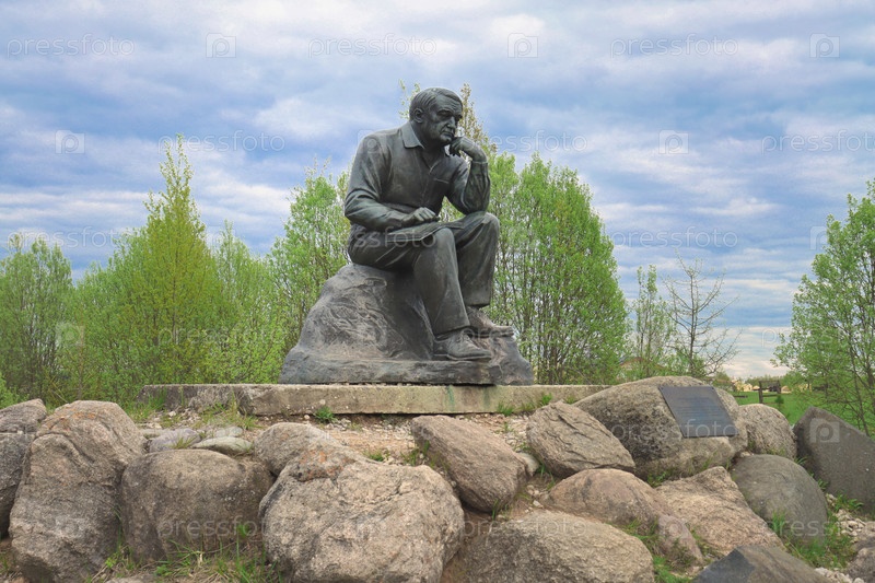 Деревня Петрово, Калужская область — апрель 2024 г.: Бронзовая скульптура Льва Николаевича Гумилева в туристическом комплексе «Этномир», горизонтальное изображение
