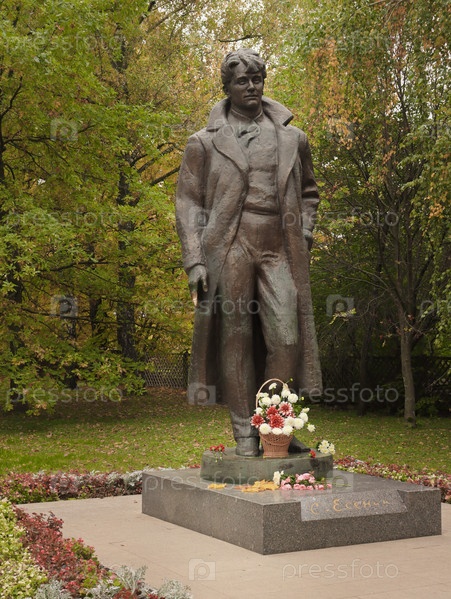 Константиново, Рязанская область, Россия - октябрь 2021 г.: Бронзовая скульптура поэта Сергея Есенина, на месте, где он провел детство и вырос. Скульптура в полный рост