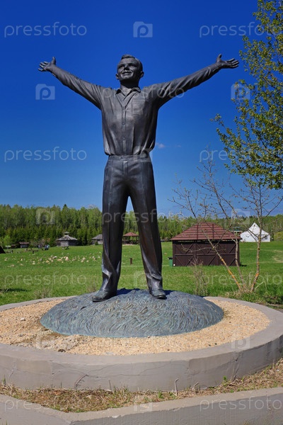 Деревня Петрово, Калужская область — апрель 2024 г.: Бронзовая скульптура Юрия Гагарина в туристическом комплексе «Этномир»