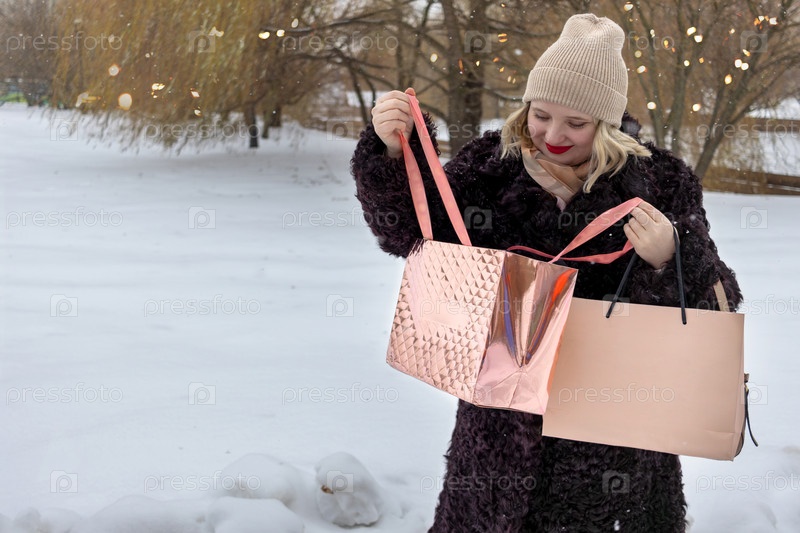 Женщина в шерсти и шляпе заглядывает в сумки, полные рождественских подарков, когда идет по зимней снежной улице. Рождественские покупки. Copyspace для текста