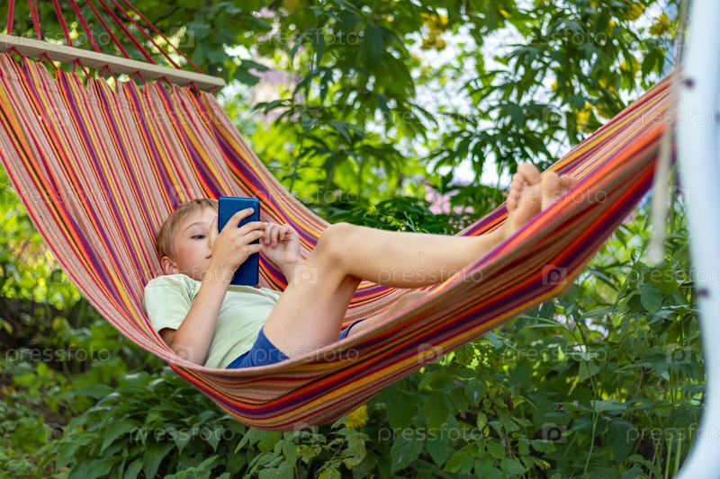 Мальчик с телефоном отдыхает в гамаке в летнем саду. Жизнь в Интернете, зависимость от гаджетов