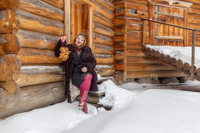 Женщина в экстравагантной одежде с бубликами на Масленице возле деревянного здания