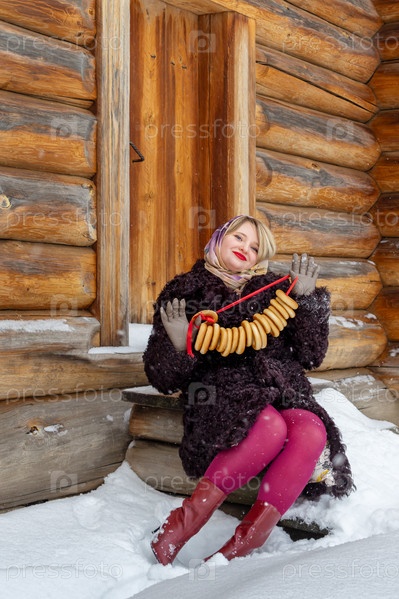 Женщина в экстравагантной одежде с бубликами на Масленице возле деревянного здания. Крупный план